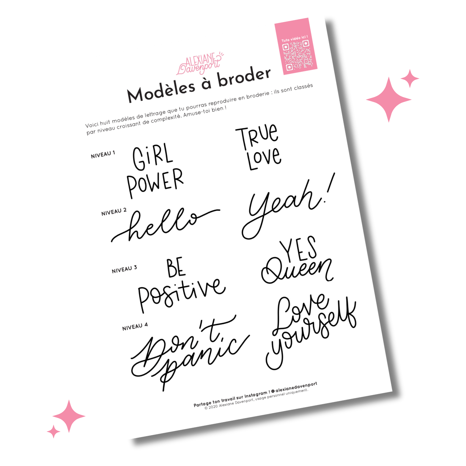 Une fiche de modèles de lettering à reproduire et broder, avec plusieurs niveaux de difficulté.